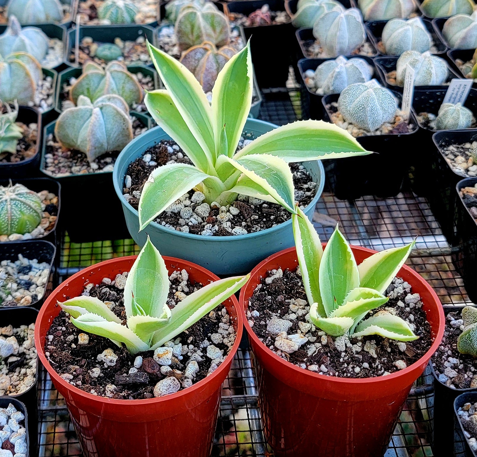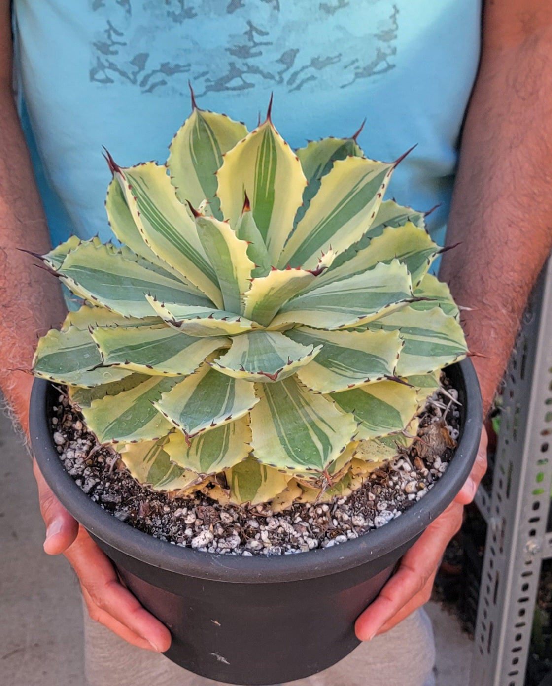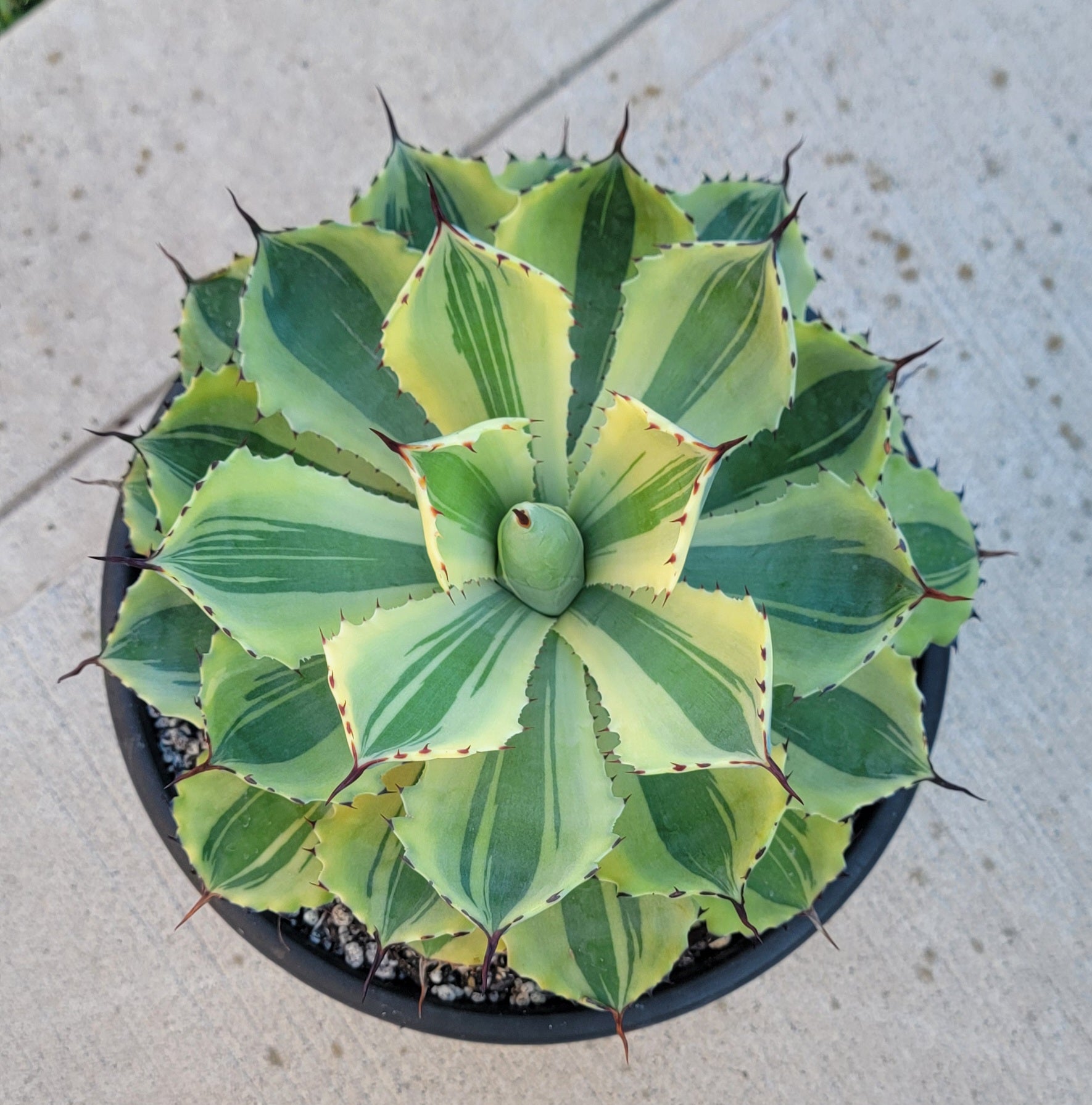 Agave 'Desert Diamond' is slightly slower growing due to the extra white in the leaf, but will eventually make a 15" tall x 18" wide, sparsely offsetting variegated rosette. Agave 'Desert Diamond' is a stunning century plant, especially in a container for the summer patio.
