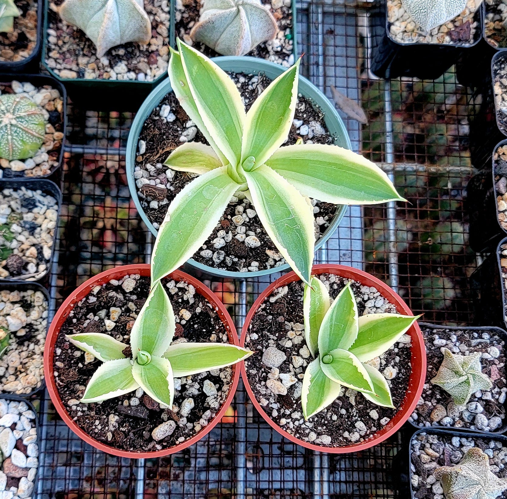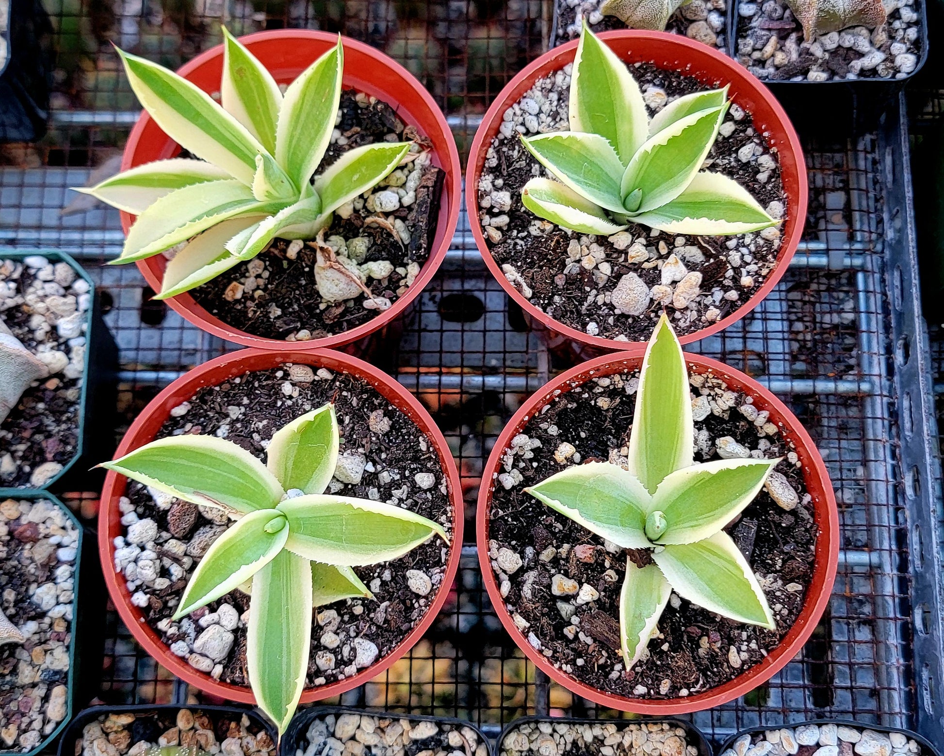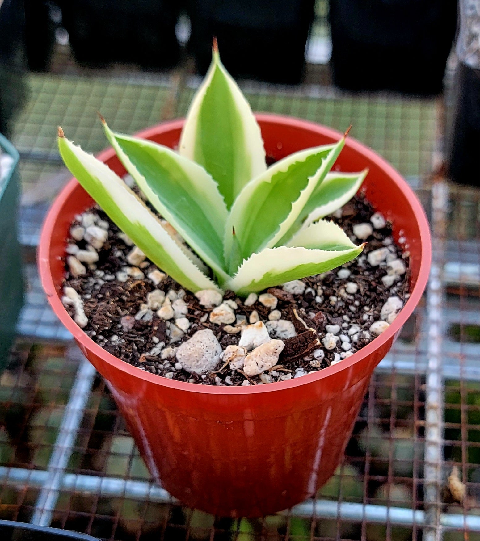 Agave 'Desert Diamond' is slightly slower growing due to the extra white in the leaf, but will eventually make a 15" tall x 18" wide, sparsely offsetting variegated rosette. Agave 'Desert Diamond' is a stunning century plant, especially in a container for the summer patio.