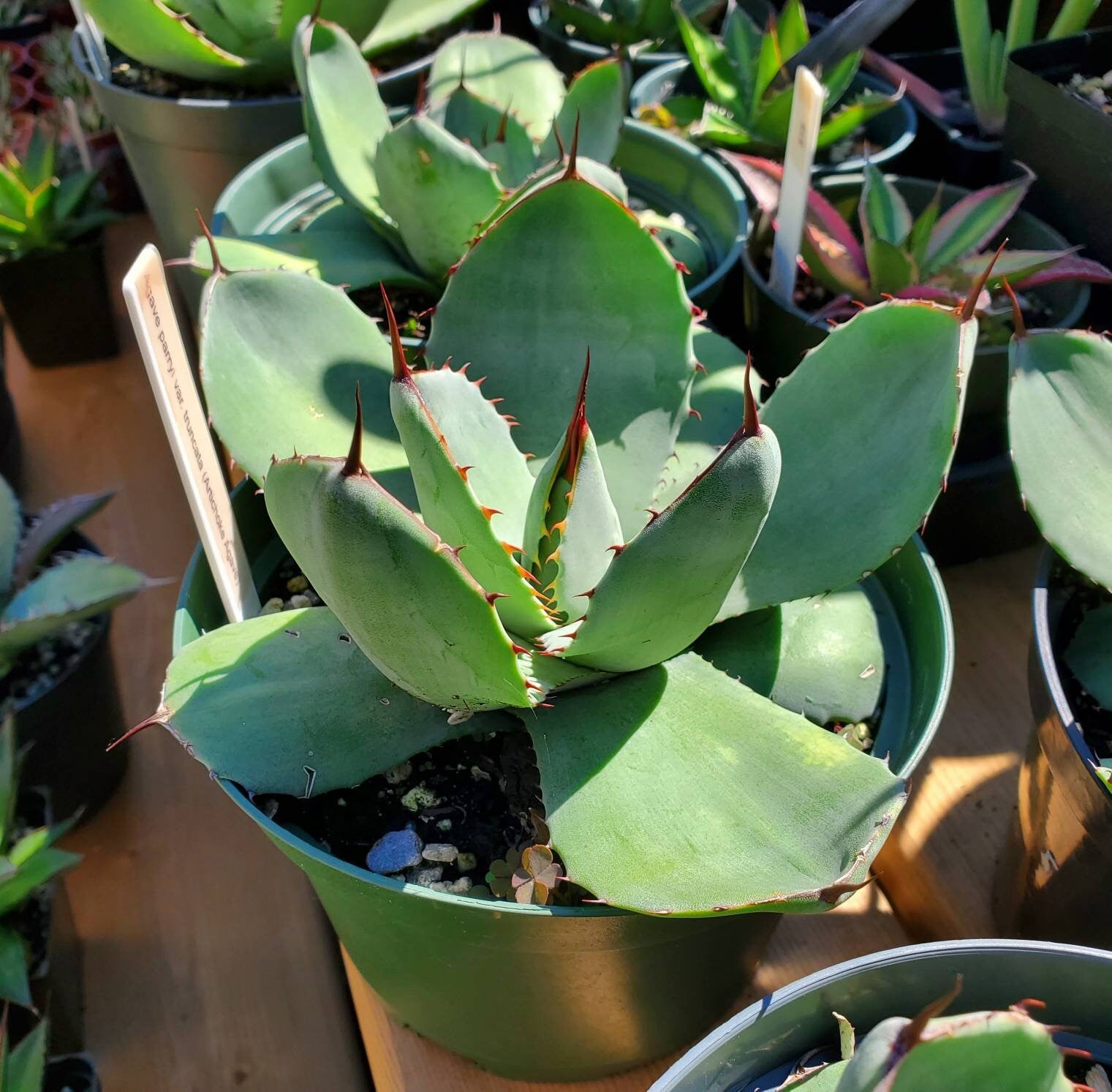 Agave parryi var. truncata - A compact rosette-forming succulent with broad, short, squared-off blue-gray leaves which have prominent reddish-brown teeth and terminal spines. Individual plants grow to 2 to 3 feet tall by 3 to 4 feet wide. When the plants are mature, a flower spike rises 10 to 20 feet bearing orange buds that open yellow - flowering usually occurs in summer. Plant in full sun. It requires very little to no irrigation in coastal gardens and is hardy to around 15° F. This agave, native from Durango to Zacatecas Mexico, is very attractive in the succulent garden as a large specimen plant or in large pots.