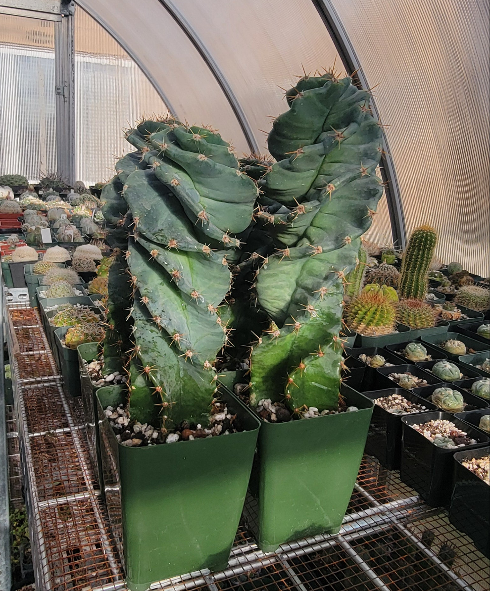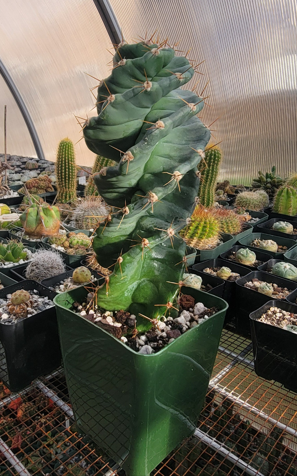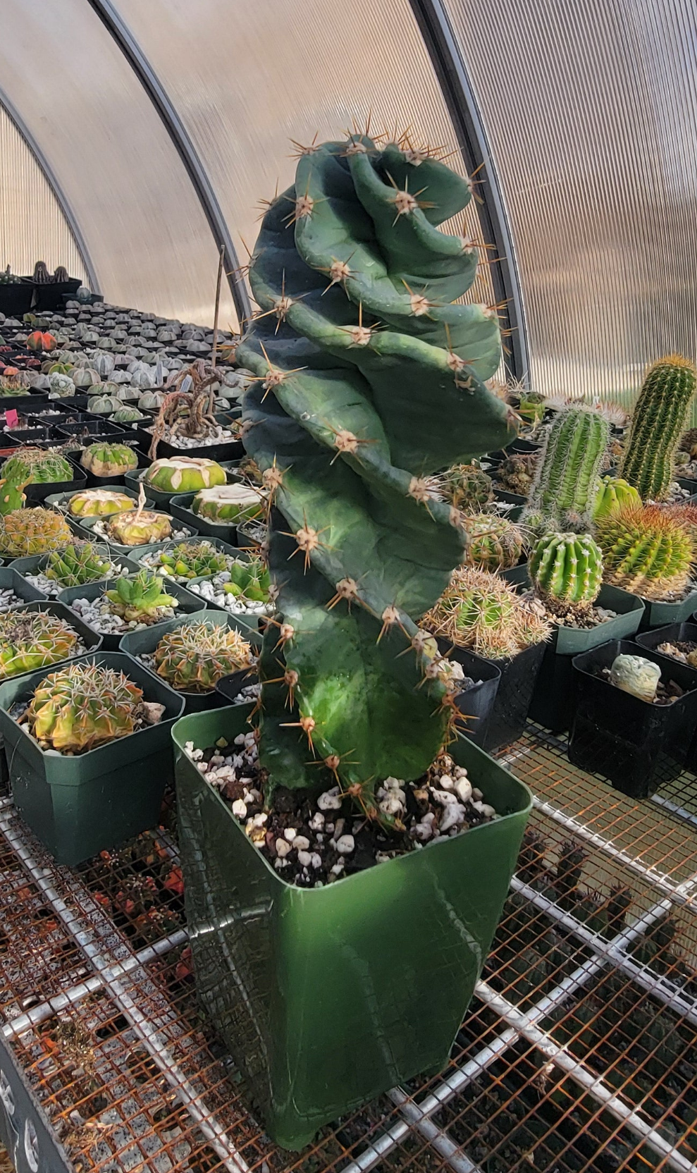 The Cereus forbesii 'Spiralis' is a rare and visually striking architectural cactus, boasting tall, columnar, blue-green, spiral stems that branch out in a candelabra-like arrangement.