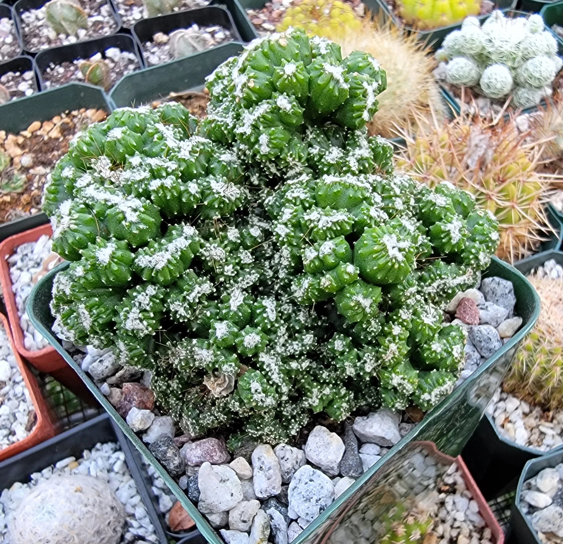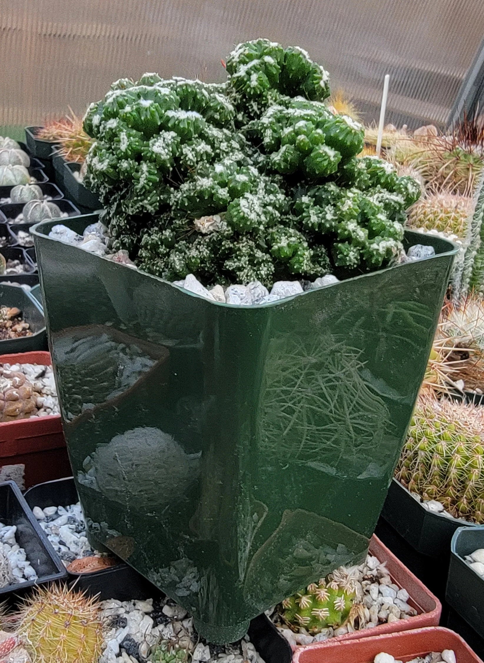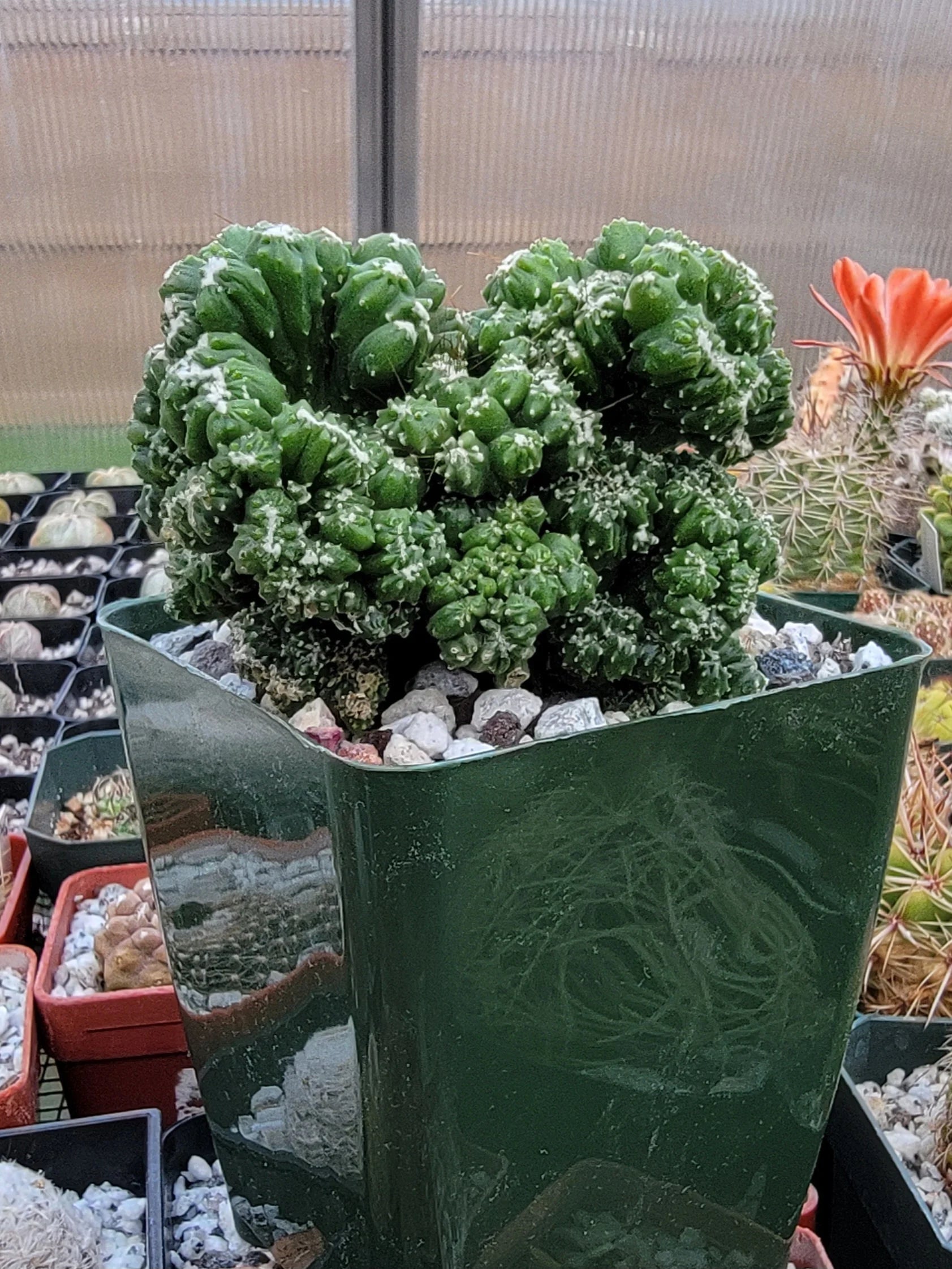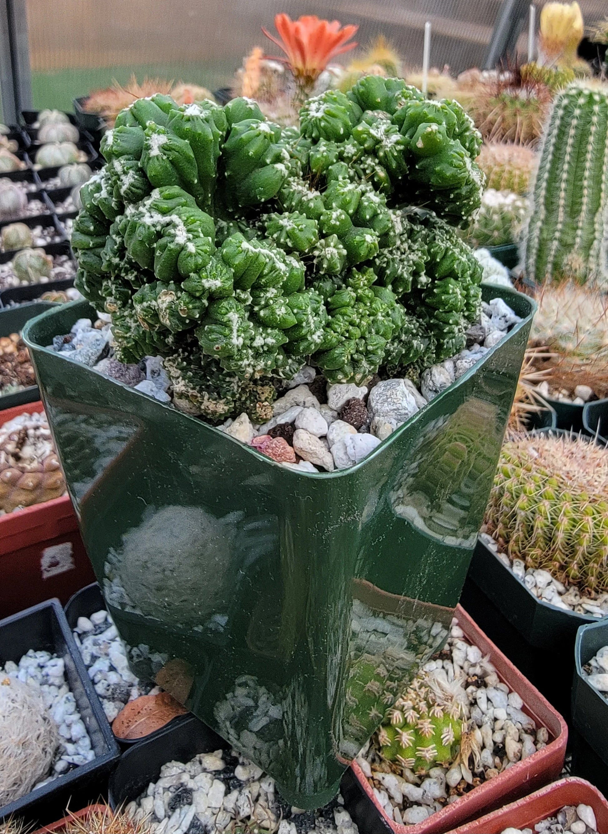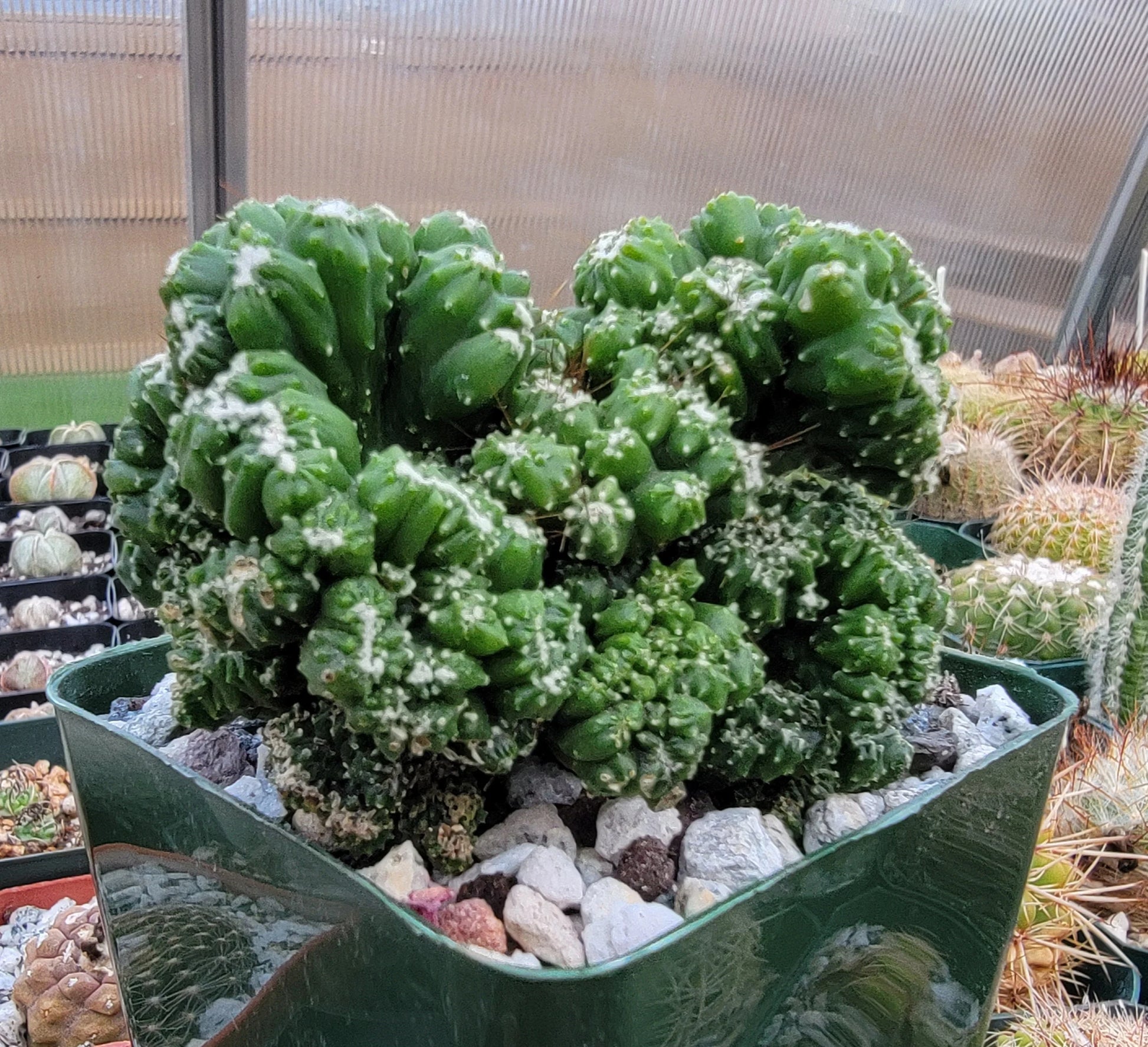 Cereus repandus f. monstrosus 'Petra': A branching, columnar cactus with coppery red spines. This monstrose variety has bumpy, knobby stems, unlike the straight, ribbed form of the typical species and this particular cultivar is much more dense than its counterpart. It has spread widely, but its native range is likely the western Caribbean and Venezuela. It blooms with white and red flowers that develop into large, reddish fruits that resemble apples.
