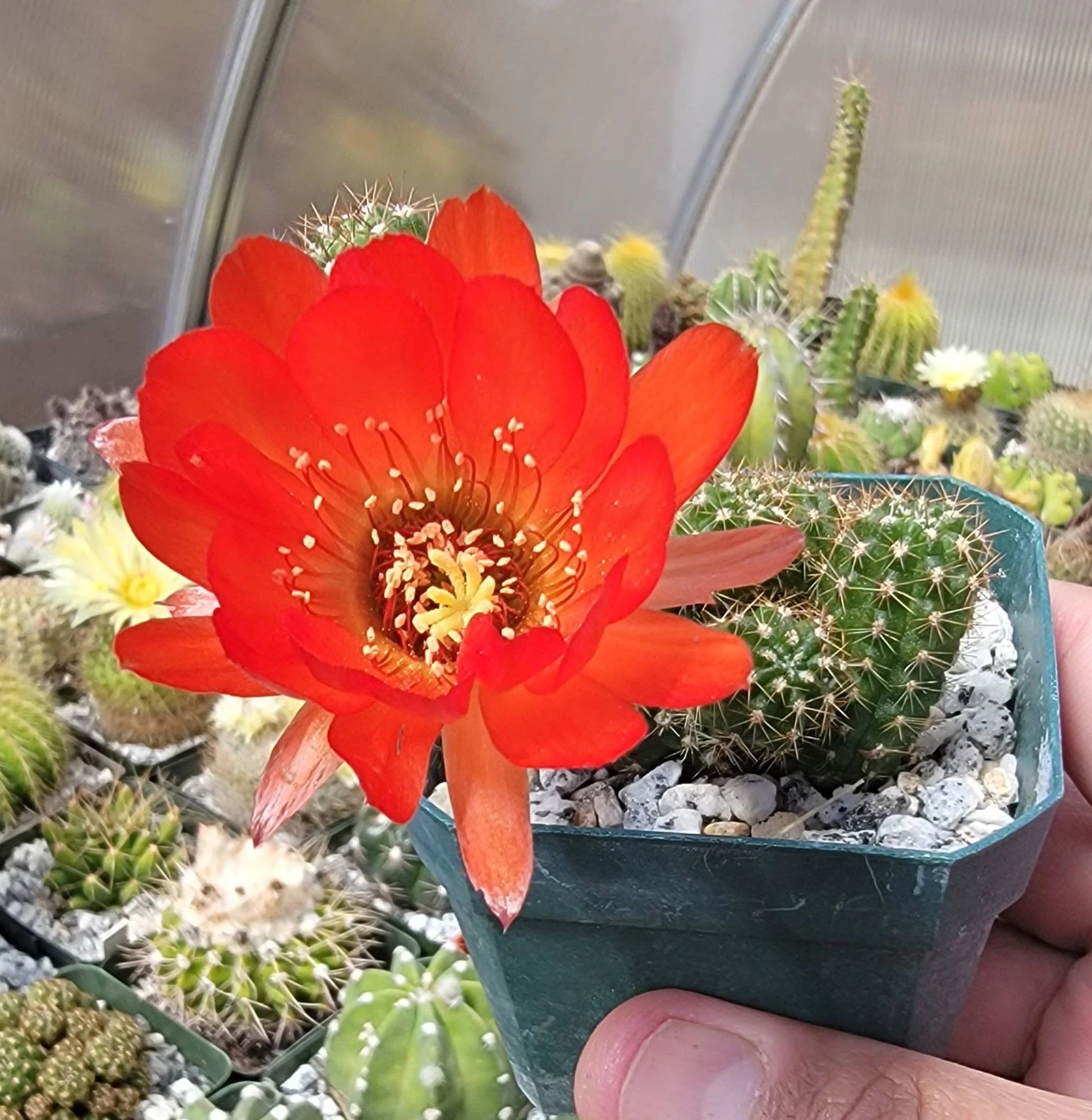 E. chamaecereus has long stems about 1 cm (0.4 in) across. Orange, pink, yellow, or red flowers up to 4 cm (1.6 in) wide appear in late spring. In cultivation, E. chamaecereus is hardy to temperatures as low as −7 °C (19 °F) if kept dry.