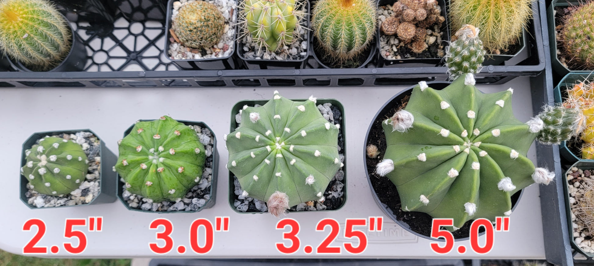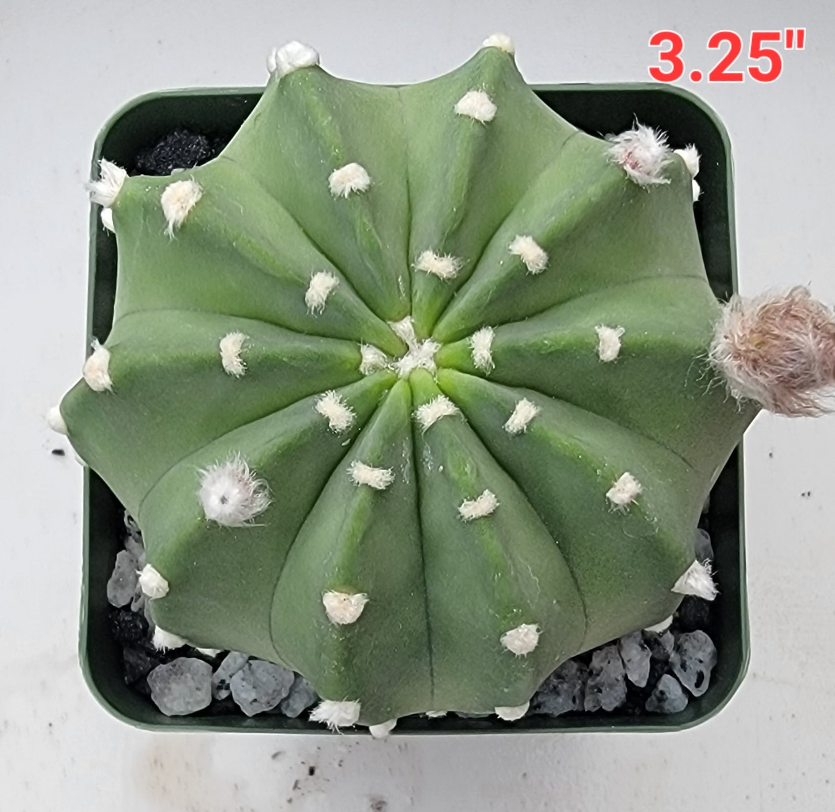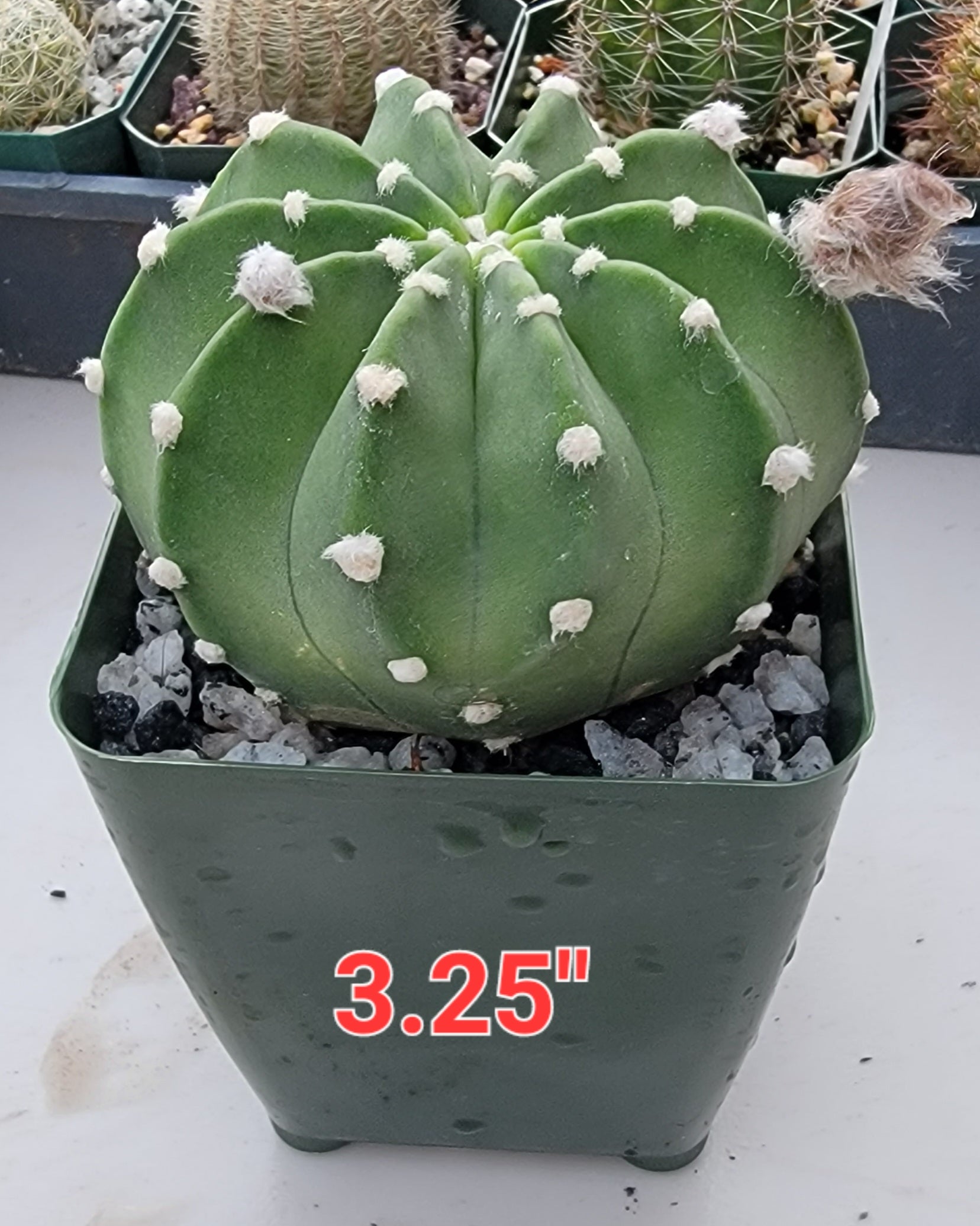 Stem: Solitary or offsetting from near the base, globose, grey-green, depressed apically, 5-8 cm tall, 7-12 cm in diameter (often elongate and up to 30 cm high in cultivation)