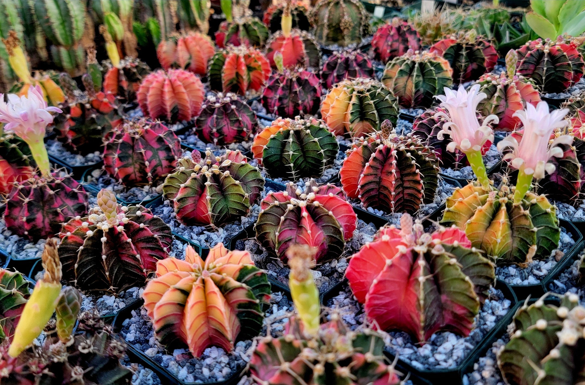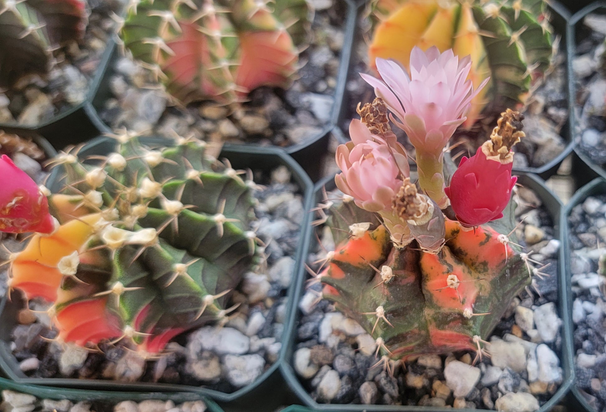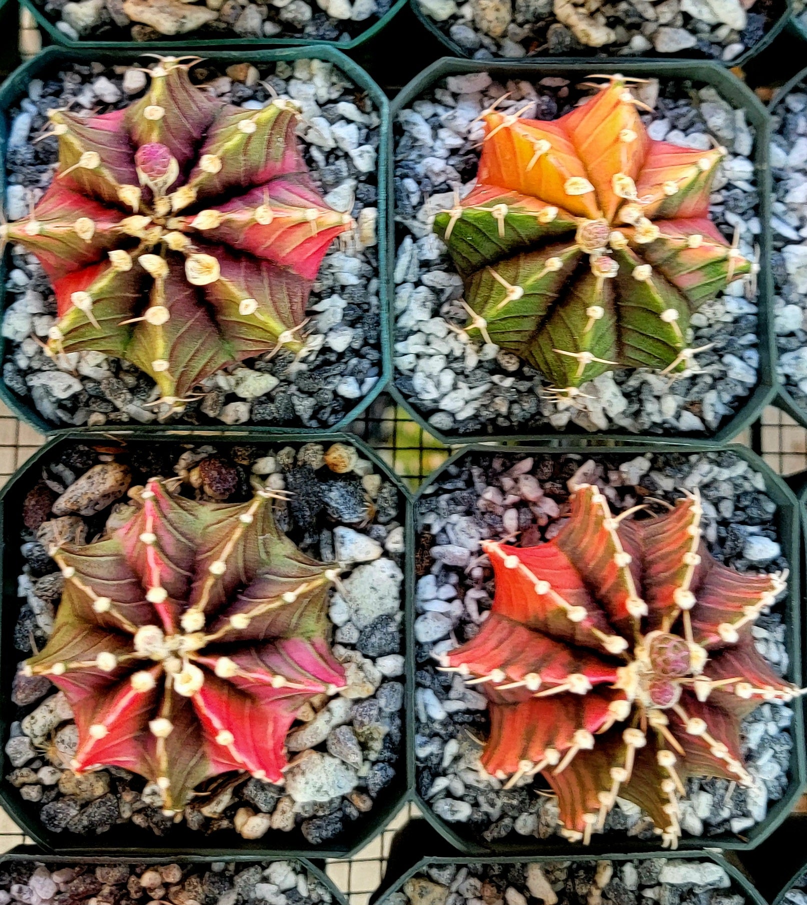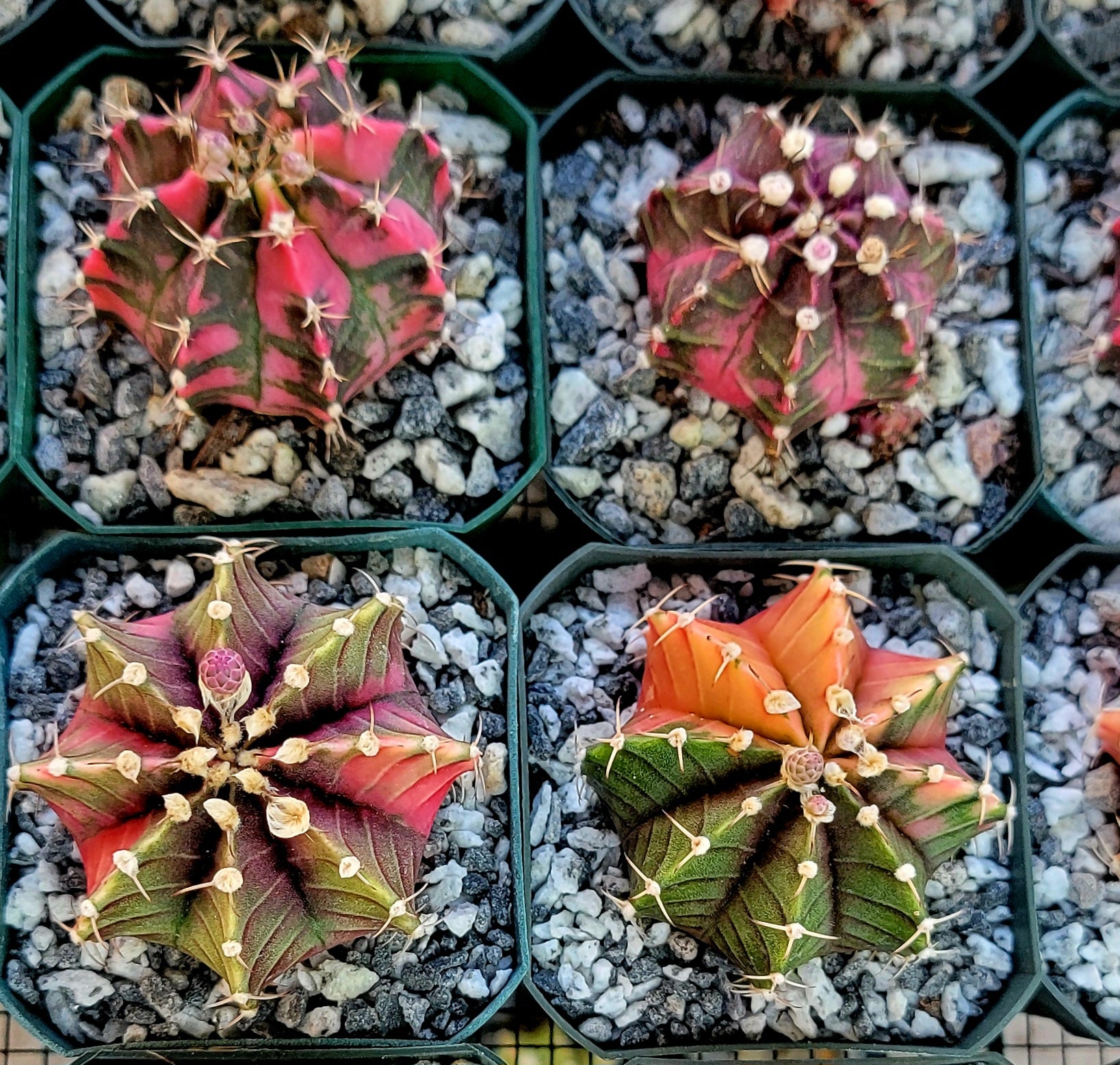 The blooming beauty of Gymnocalycium Mihanovichii plants is seen in its vibrant bright colors.