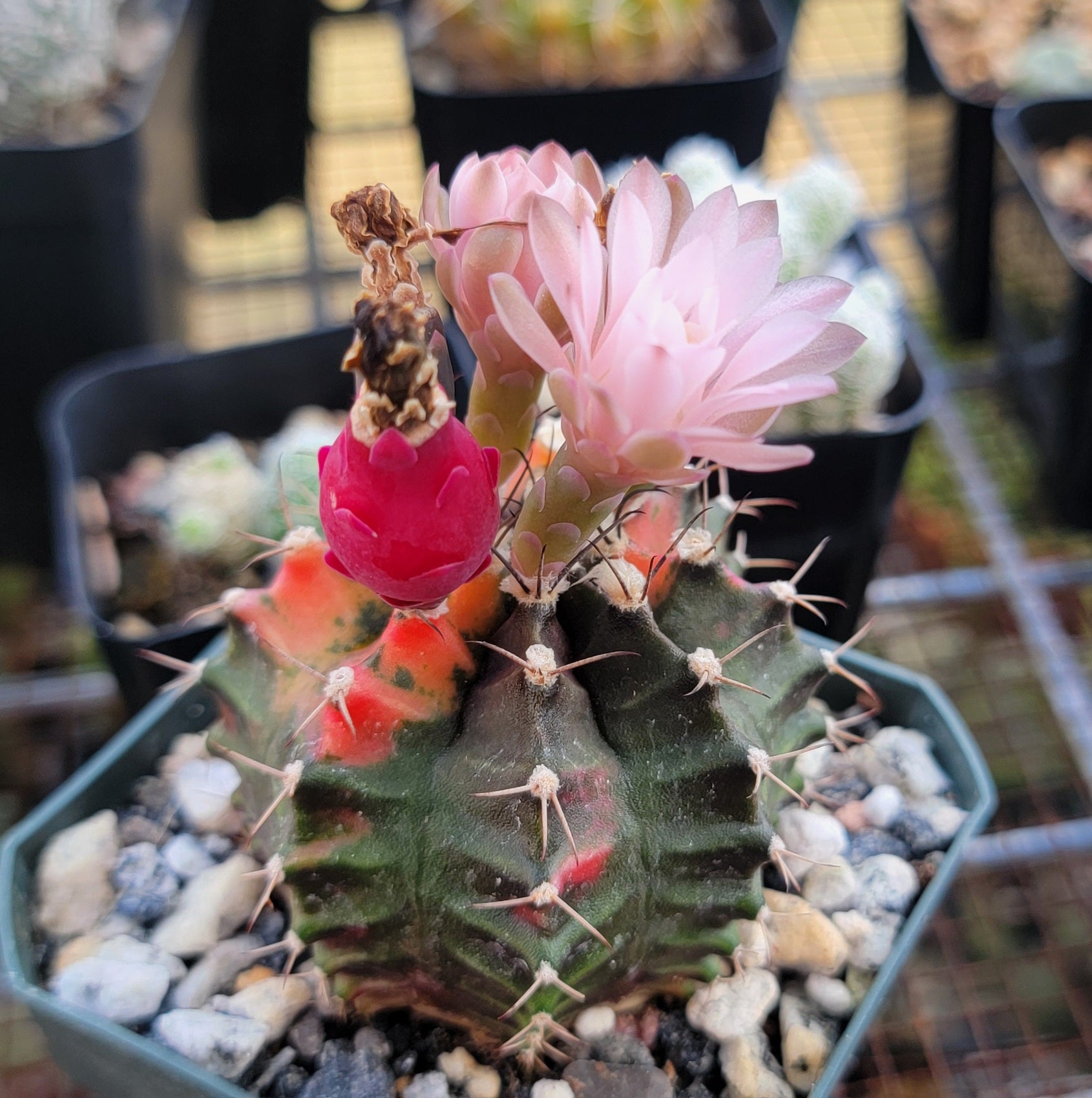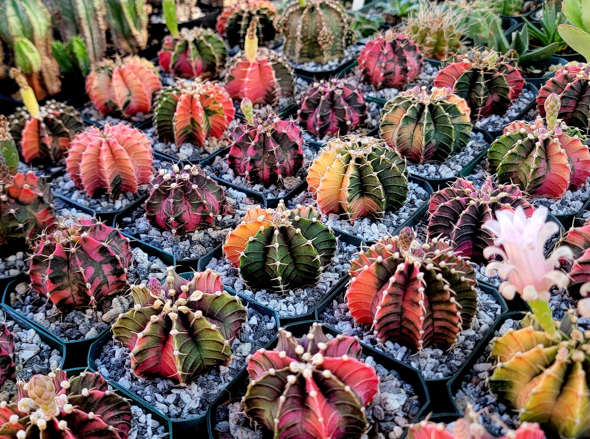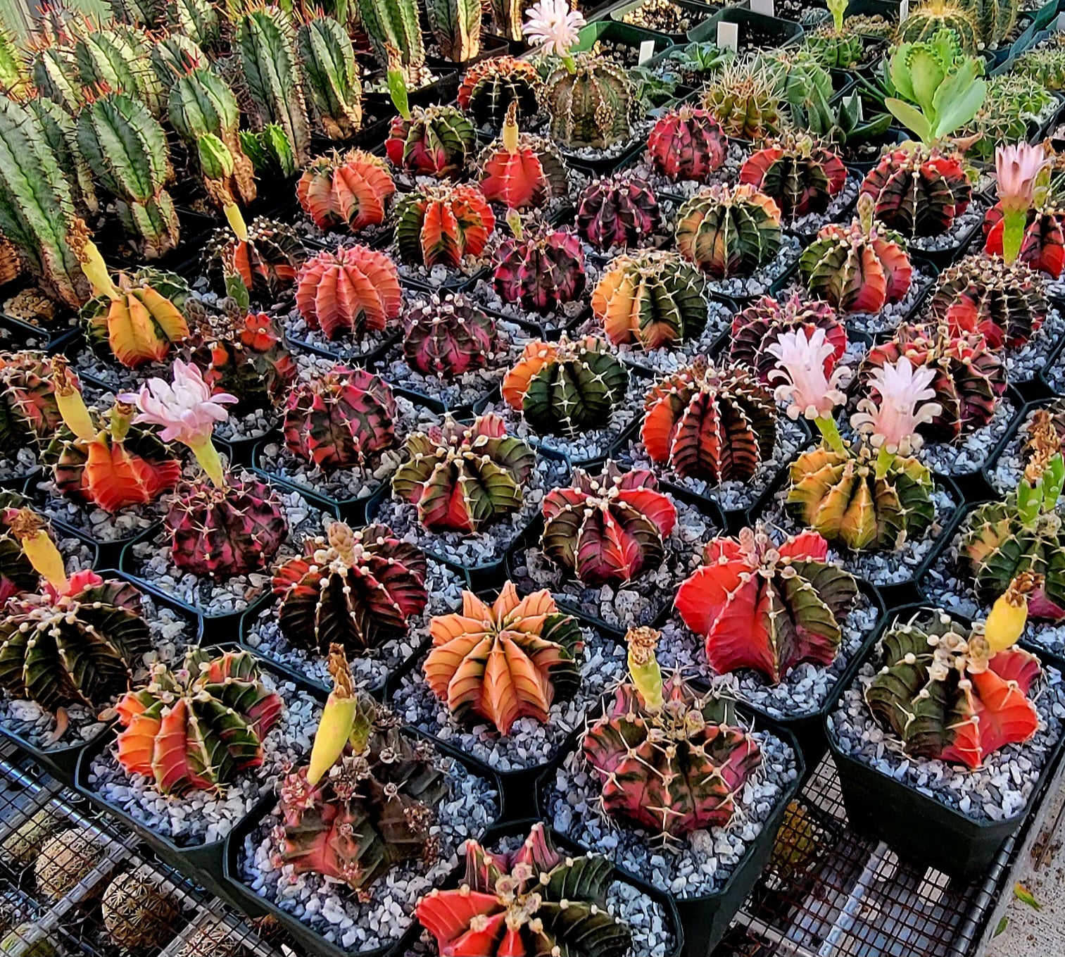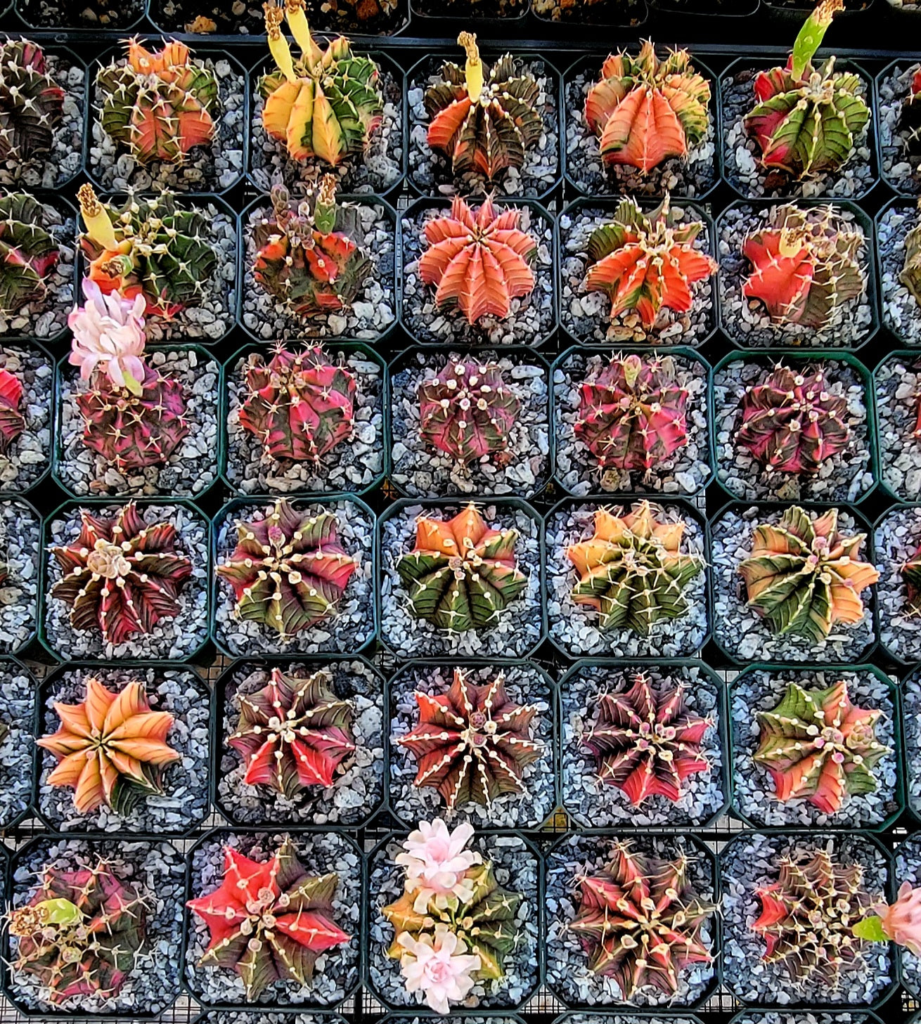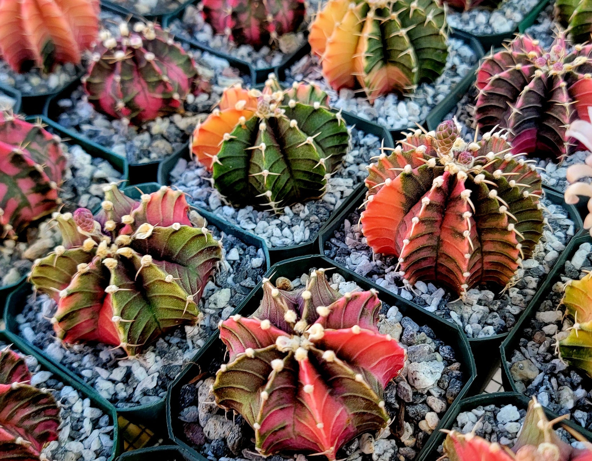 The blooming beauty of Gymnocalycium Mihanovichii plants is seen in its vibrant bright colors.