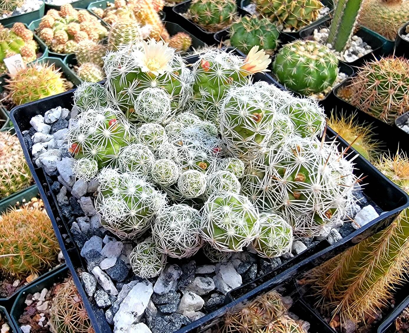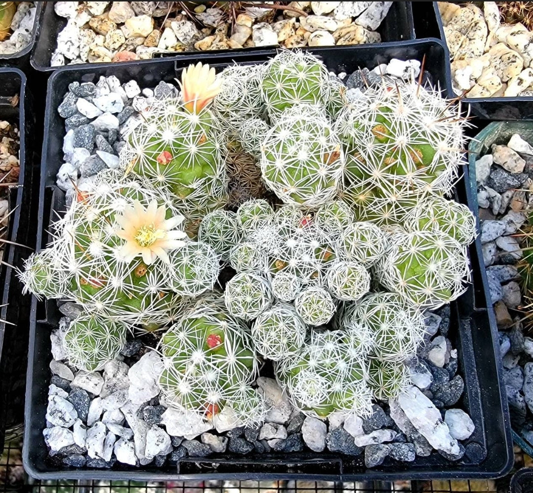 Mammillaria gracilis v. fragilis is a charming, tiny cactus that is native to Central Mexico. Its small round bodies are densely covered with interlaced white spines. This gives the impression of white “thimbles”. This cactus clusters vigorously to form large mats. In late winter it features creamy yellow flowers. It requires gritty succulent or cactus potting soil; it prefers bright light and good airflow. Water when the soil is completely dry to the touch. When one of the little bodies breaks off, it can be propagated into a new plant. This is great for use in a fairy garden or in an alpine trough garden.