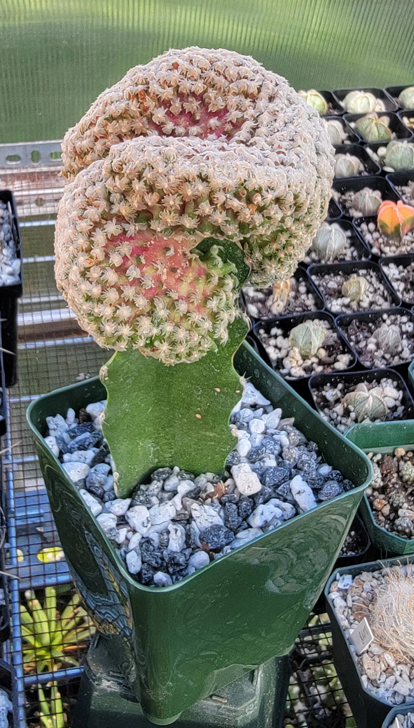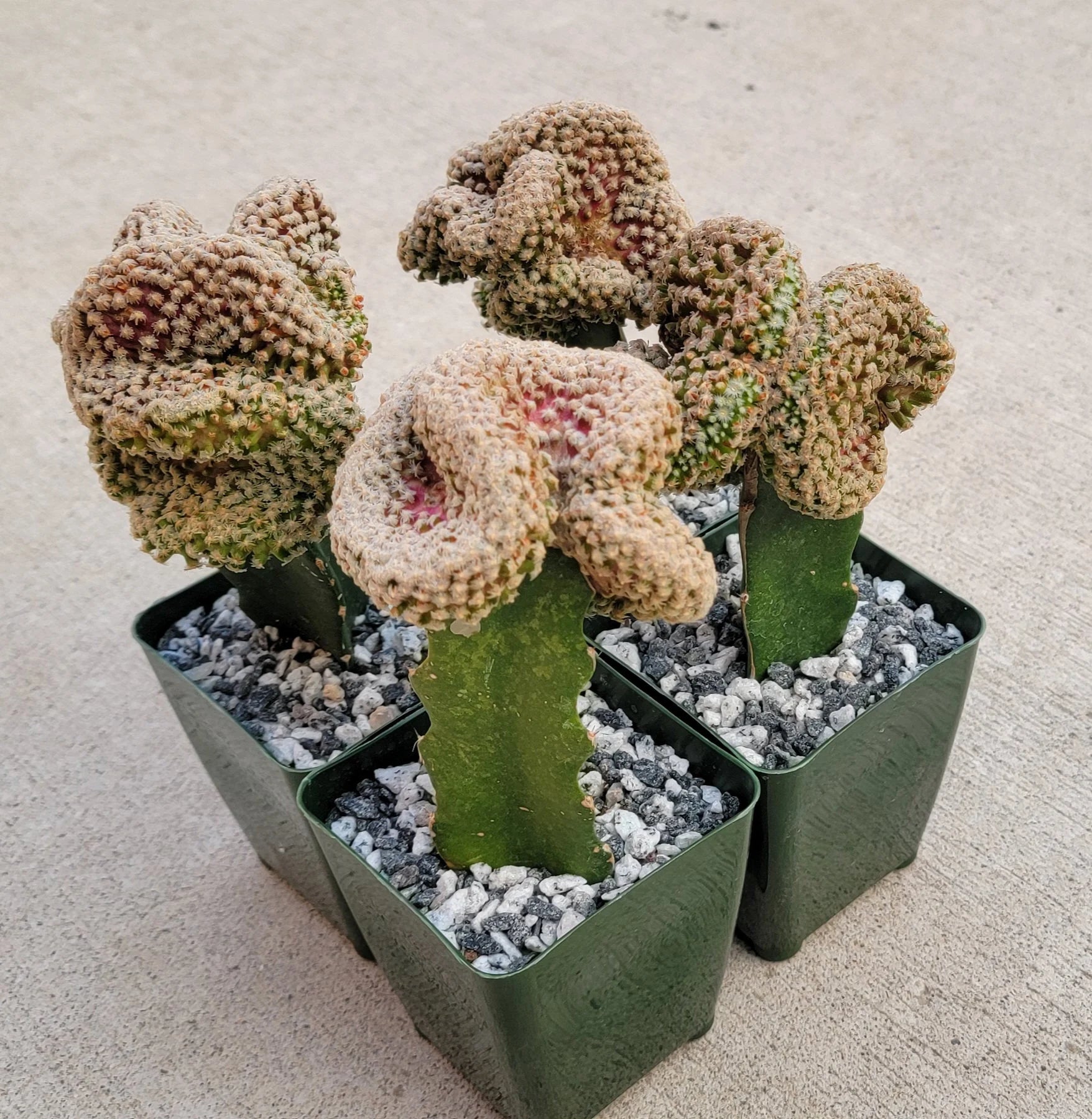Mammillaria theresae 'Cristata' is a rare small cactus with fan-shaped olive-green stems with a magenta-red tint. It has 22 to 30 white to yellowish-white spines per areole. Flowers are pink with pale yellow stigmas, up to 2 inches (5 cm) long, and up to 1.4 inches (3.5 cm) in diameter.