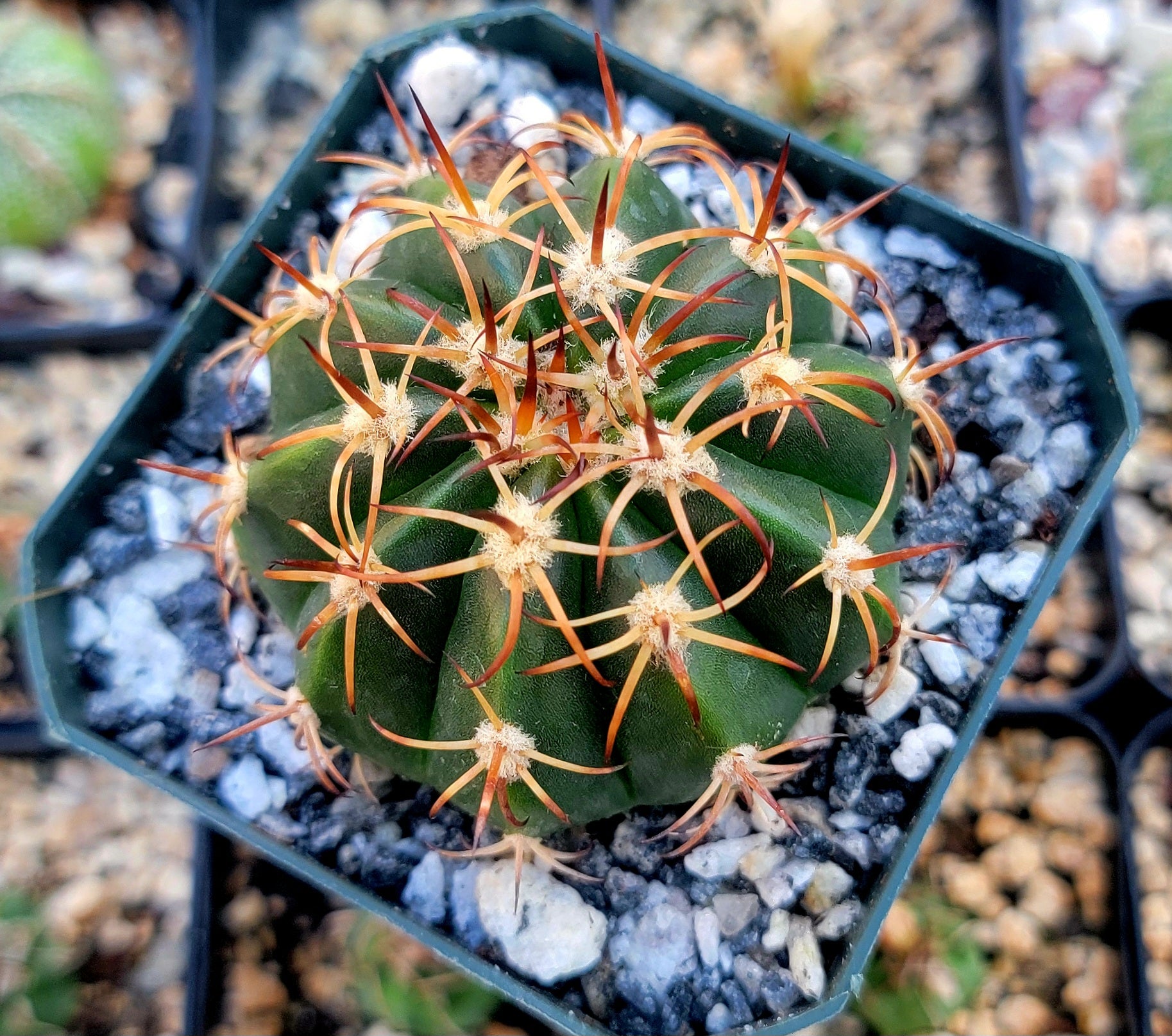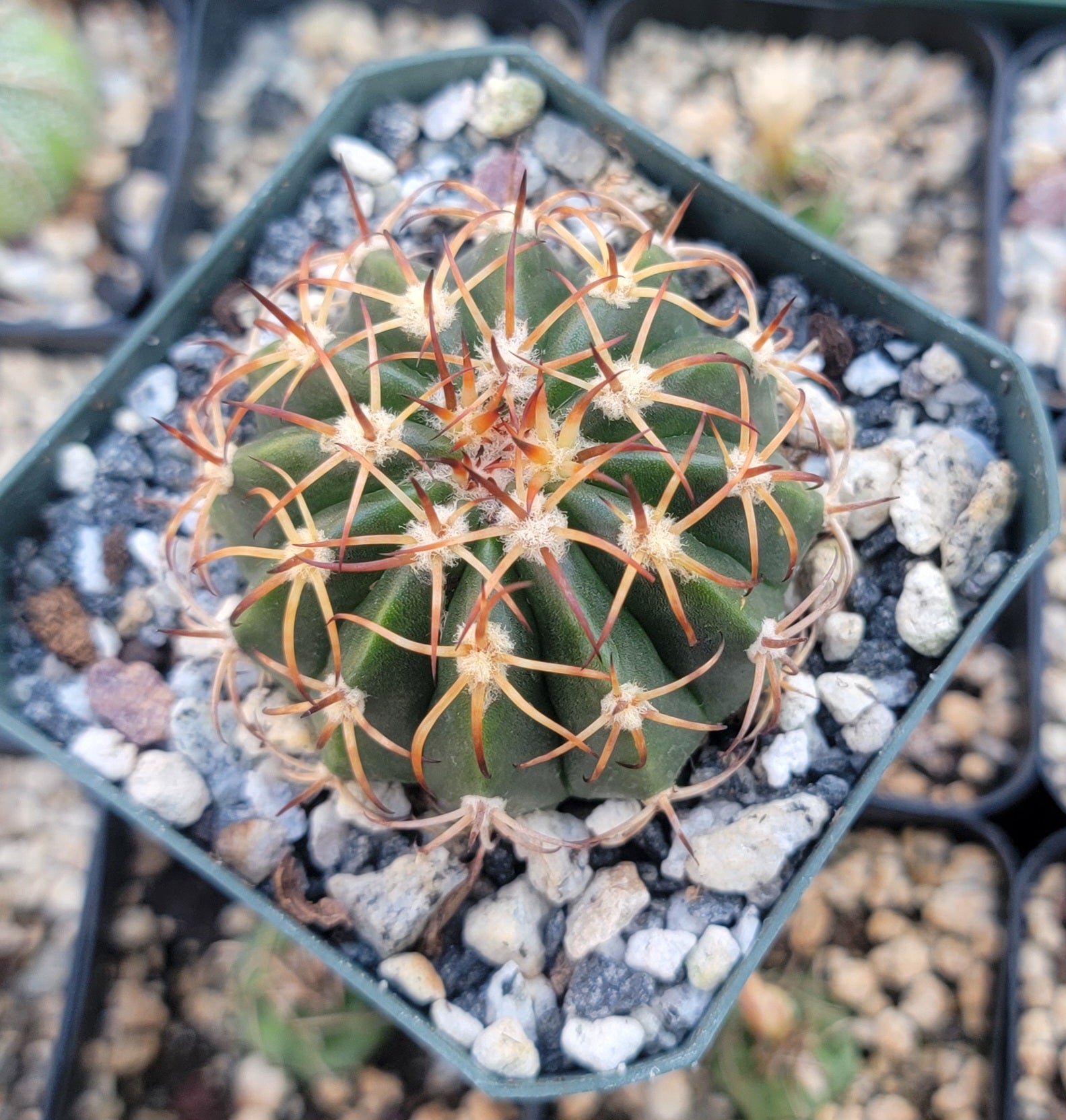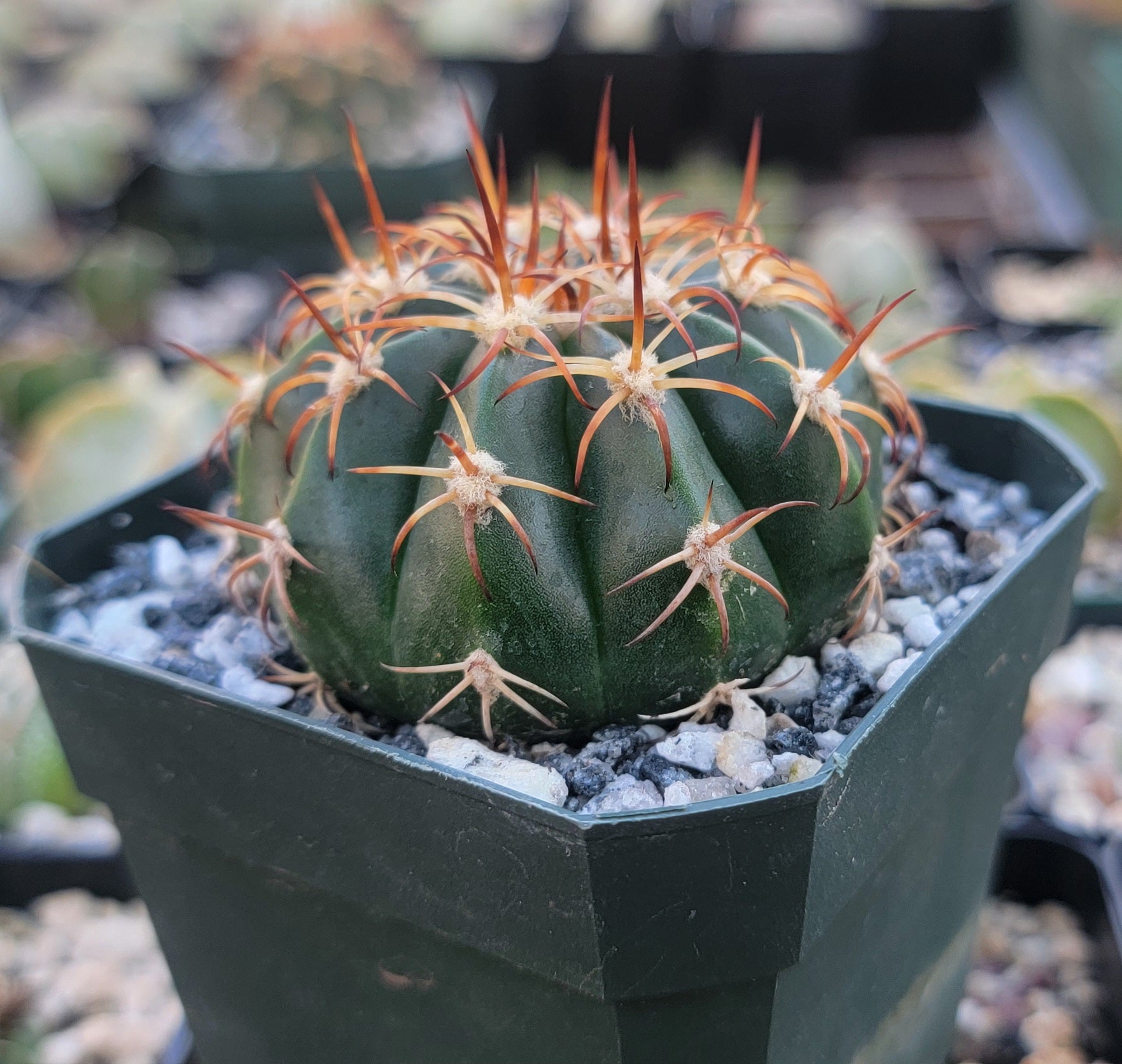 Melocactus curvispinus is a fascinating indoor cactus, loved for its globular stems and distinctive colorful cephalium. It adds an exotic and sculptural touch to any interior space, providing a natural and captivating aesthetic.