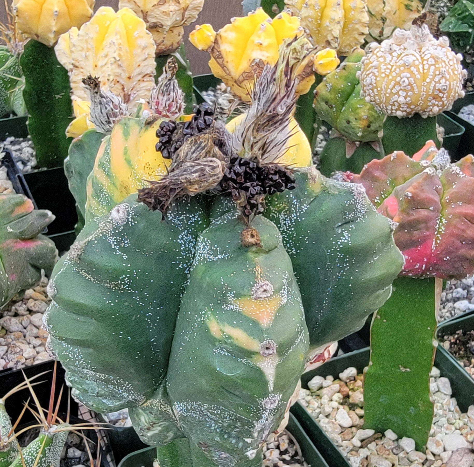 This rare Japaese cultivar is unmistakable for its pointed tubercles along the ribs edges, in fact its areoles stick out with large notches between them, giving them a saw tooth look. The variegated plants are rare and more beautiful.
